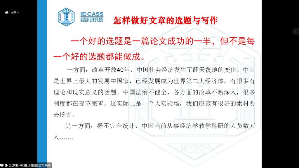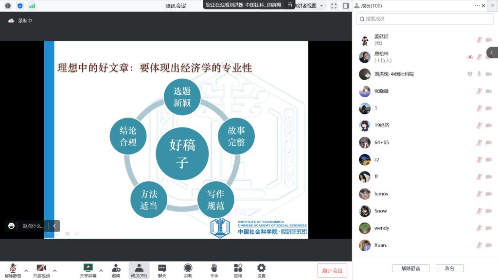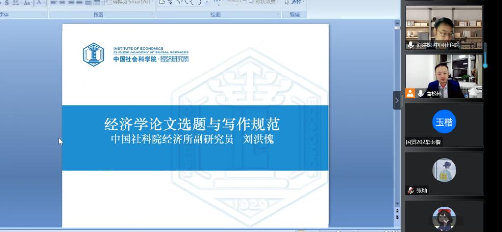 2022年11月3日,应学院邀请,中国社会科学院经济研究所副研究员、《经济学动态》责任编辑刘洪愧通过线上会议为2007so太阳集团师生作了“经济学论文选题与写作规范”的专题报告,院长唐松林主持了会议。
