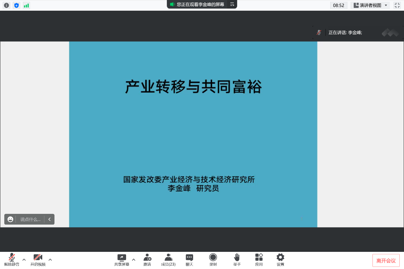 李金峰研究员从改革开放以来我国经济总量和国民收入的提升、与世界其他国家相比仍存在差距且制约发展的问题、共同富裕的基本要求、党中央国务院对地区间产业转移问题的重视、产业转移的成效、未来环境影响因素及工作思路与重点等九个层面深入浅出地分析了产业转移对促进、实现共同富裕的重要作用。