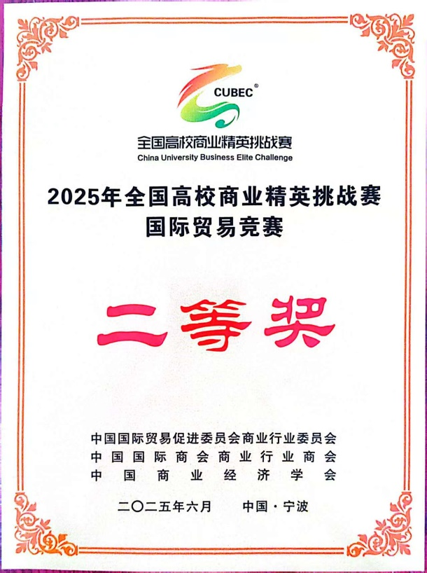 2025年6月7日,第十四届全国高校商业精英挑战赛国际贸易竞赛(国际贸易业务模拟赛道)总决赛在浙江省宁波市国际会展中心正式开赛。此次参加比赛的队伍有408支、参赛师生超过3300人。由我校2007so太阳集团王萌莎和姜书竹两位老师指导,由刘淑琪、秦棋书、孟硕、程江皓、陈德晴和李睿玥六名学生组成的“解忧百纳队”,获得了烟台张裕葡萄酿酒股份有限公司的鼎力支持,在本次全国总决赛中脱颖而出,斩获二等奖。