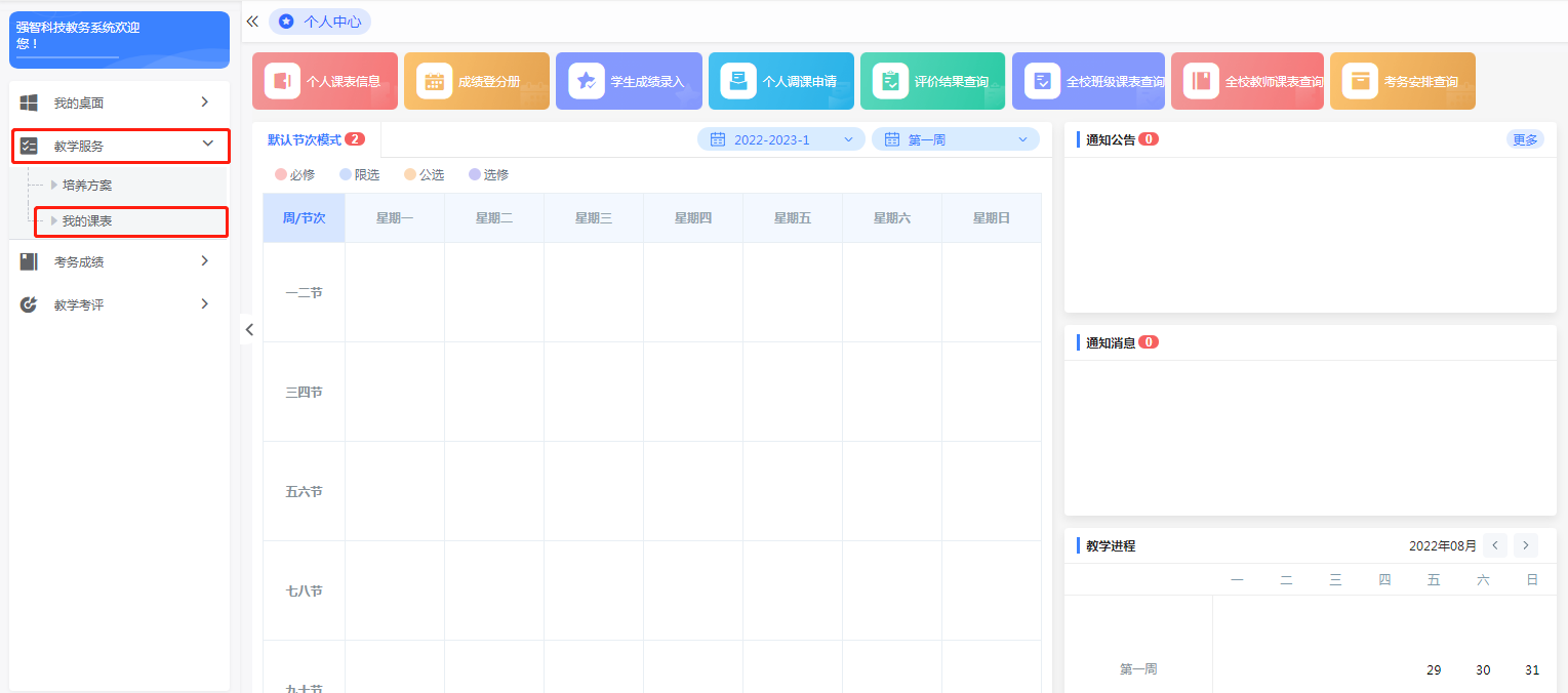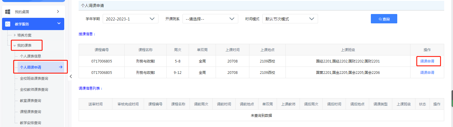 第二步:登录系统后,请点击【个人调课申请】;或点击【教学服务】-【我的课表】